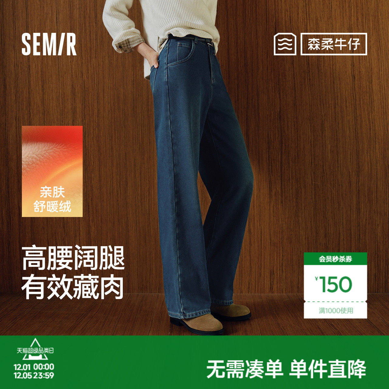 森马显腿长抓毛阔腿拖地牛仔裤女