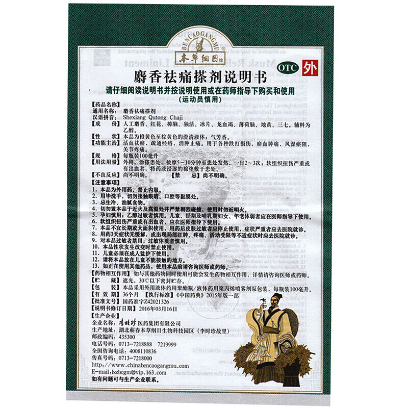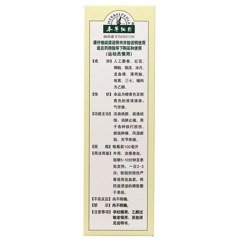 【本草纲目】麝香祛痛搽剂100ml*1瓶/盒跌打损伤瘀血肿痛风湿瘀阻关节疼痛消肿由店盟依据商品的销售量、好评率和价格,以及天猫旗舰店的描述相符评分 、服务态度评分和发货速度评分进行筛选,该商品的完整标题为“本草纲目麝香祛痛搽剂100ml”,选自天猫旗舰店店名为“药吉祥大药房旗舰店”,该店已通过企业认证和支付宝认证为天猫旗舰店,店铺dsr评分,主营品牌药吉祥大药房,店铺所在地“辽宁 鞍山”,所属一级分类为“OTC药品/国际医药”,子分类为“风湿骨外伤”。精挑细选让消费者在天猫旗舰店里购物更省心便捷实惠,网上购物时更加方便的挑选即称心又便宜的商品。