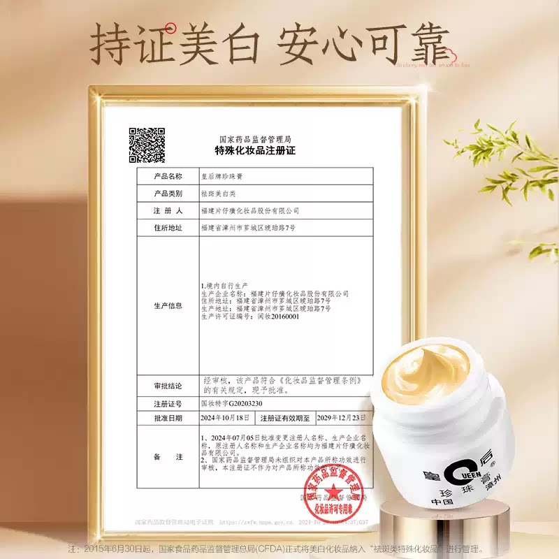 提亮美白霜持证上岗淡化暗沉由店盟依据商品的销售量、好评率和价格,以及天猫旗舰店的描述相符评分 、服务态度评分和发货速度评分进行筛选,该商品的完整标题为“片仔癀皇后牌珍珠膏美白祛斑滋养保湿紧致抗老面霜官方旗舰店正品”,选自天猫旗舰店店名为“PZH片仔癀旗舰店”,该店已通过企业认证和支付宝认证为天猫旗舰店,店铺dsr评分,主营品牌PZH片仔癀,店铺所在地“广东 广州”,所属一级分类为“美容护肤/美体/精油”,子分类为“乳液/面霜”。精挑细选让消费者在天猫旗舰店里购物更省心便捷实惠,网上购物时更加方便的挑选即称心又便宜的商品。