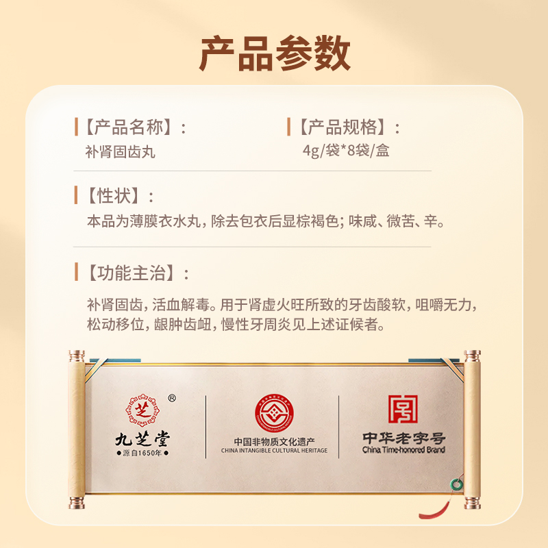 【九芝堂】补肾固齿丸4g*8袋/盒由店盟依据商品的销售量、好评率和价格,以及天猫旗舰店的描述相符评分 、服务态度评分和发货速度评分进行筛选,该商品的完整标题为“九芝堂补肾固齿丸牙周炎治疗药牙龈出血口臭牙疼药牙齿松动牙龈炎”,选自天猫旗舰店店名为“九芝堂医药旗舰店”,该店已通过企业认证和支付宝认证为天猫旗舰店,店铺dsr评分,主营品牌九芝堂医药,店铺所在地“广东 广州”,所属一级分类为“OTC药品/国际医药”,子分类为“健脾益肾”。精挑细选让消费者在天猫旗舰店里购物更省心便捷实惠,网上购物时更加方便的挑选即称心又便宜的商品。