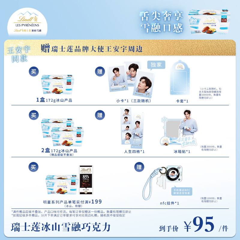 【王安宇同款】Lindt/瑞士莲官方正品冰山雪融牛奶黑巧克力172g由店盟依据商品的销售量、好评率和价格,以及天猫旗舰店的描述相符评分 、服务态度评分和发货速度评分进行筛选,选自天猫旗舰店店名为“瑞士莲食品旗舰店”,该店已通过企业认证和支付宝认证为天猫旗舰店,店铺dsr评分,主营品牌瑞士莲食品,店铺所在地“上海”,所属一级分类为“零食/坚果/特产”,子分类为“牛奶巧克力”。精挑细选让消费者在天猫旗舰店里购物更省心便捷实惠,网上购物时更加方便的挑选即称心又便宜的商品。