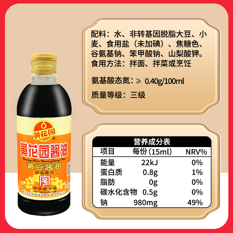 黄花园中华老字号黄豆酱油715ml由店盟依据商品的销售量、好评率和价格,以及天猫旗舰店的描述相符评分 、服务态度评分和发货速度评分进行筛选,该商品的完整标题为“黄花园中华老字号黄豆酿造酱油715ml商用炒菜小面调料非转基因”,选自天猫旗舰店店名为“黄花园旗舰店”,该店已通过企业认证和支付宝认证为天猫旗舰店,店铺dsr评分,主营品牌黄花园,店铺所在地“重庆”,所属一级分类为“粮油调味/速食/干货/烘焙”,子分类为“酱油”。精挑细选让消费者在天猫旗舰店里购物更省心便捷实惠,网上购物时更加方便的挑选即称心又便宜的商品。