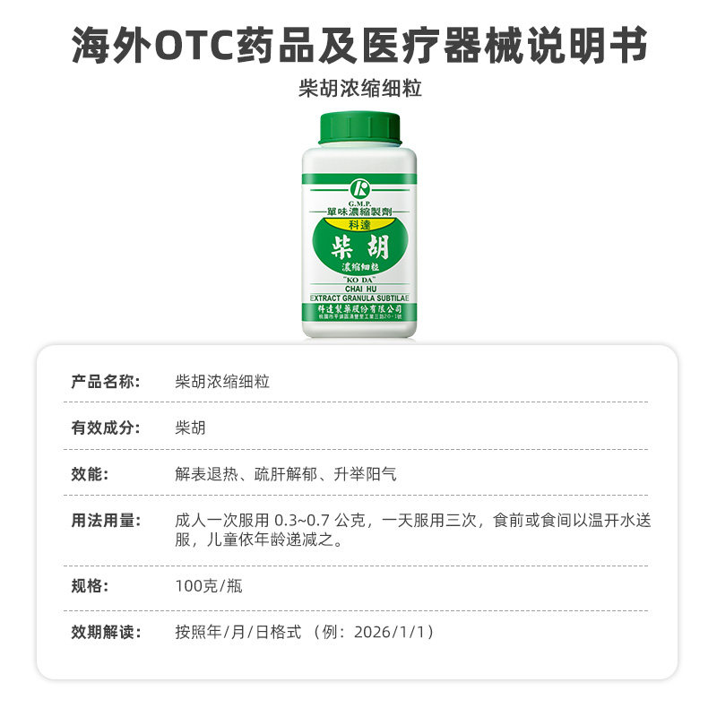 科达制药柴胡浓缩细粒100g免煎中药颗粒抓配官方旗舰店正品由店盟依据商品的销售量、好评率和价格,以及天猫旗舰店的描述相符评分 、服务态度评分和发货速度评分进行筛选,选自天猫旗舰店店名为“科达制药海外旗舰店”,该店已通过企业认证和支付宝认证为天猫旗舰店,店铺dsr评分,主营品牌科达制药,店铺所在地“香港 香港岛”,所属一级分类为“OTC药品/国际医药”,子分类为“国际解热镇痛用药”。精挑细选让消费者在天猫旗舰店里购物更省心便捷实惠,网上购物时更加方便的挑选即称心又便宜的商品。