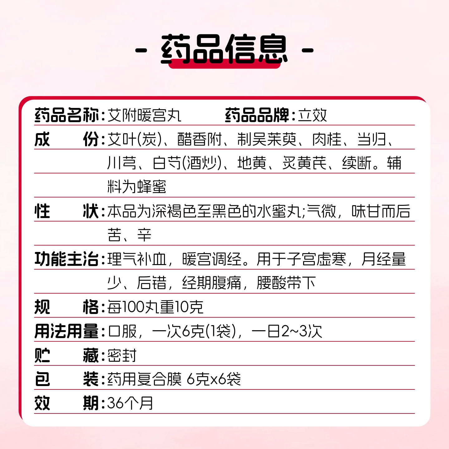 【立效】艾附暖宫丸6g*6袋/盒由店盟依据商品的销售量、好评率和价格,以及天猫旗舰店的描述相符评分 、服务态度评分和发货速度评分进行筛选,该商品的完整标题为“立效艾附暖宫丸6g*6袋 理气补血暖宫调经子宫虚寒月经量少后错”,选自天猫旗舰店店名为“鸿熙百姓福大药房旗舰店”,该店已通过企业认证和支付宝认证为天猫旗舰店,店铺dsr评分,主营品牌鸿熙百姓福大药房,店铺所在地“山东 潍坊”,所属一级分类为“OTC药品/国际医药”,子分类为“妇科用药”。精挑细选让消费者在天猫旗舰店里购物更省心便捷实惠,网上购物时更加方便的挑选即称心又便宜的商品。